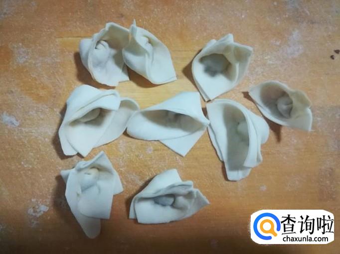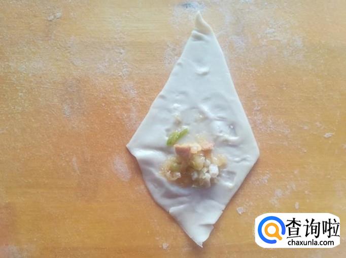 把馄饨皮向上折起,包住肉馅,再把两角捏死,包成馄饨的样子,如图,这样馄饨就包好了。