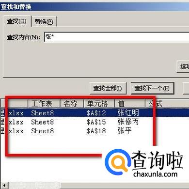 那么,查找对话框下部分即显示出符合要求的单元格地址。所有“张”姓的人名就查找出来了。