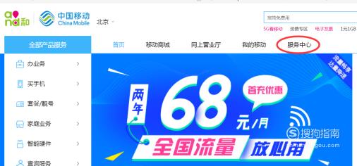 进入移动官网并找到服务中心;