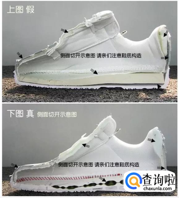 市面上的假鞋缝接做工粗糙,车缝线容易脱线,logo模糊。