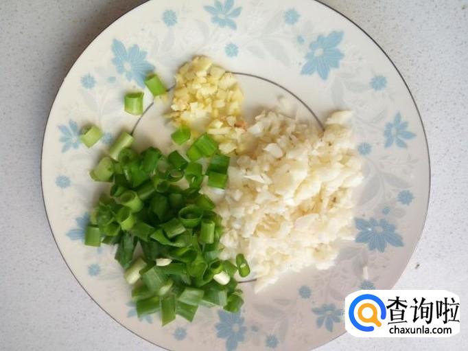 葱,姜,蒜切成末,装盘备用(蒜要多一些,用来提味,我用了六瓣蒜)。