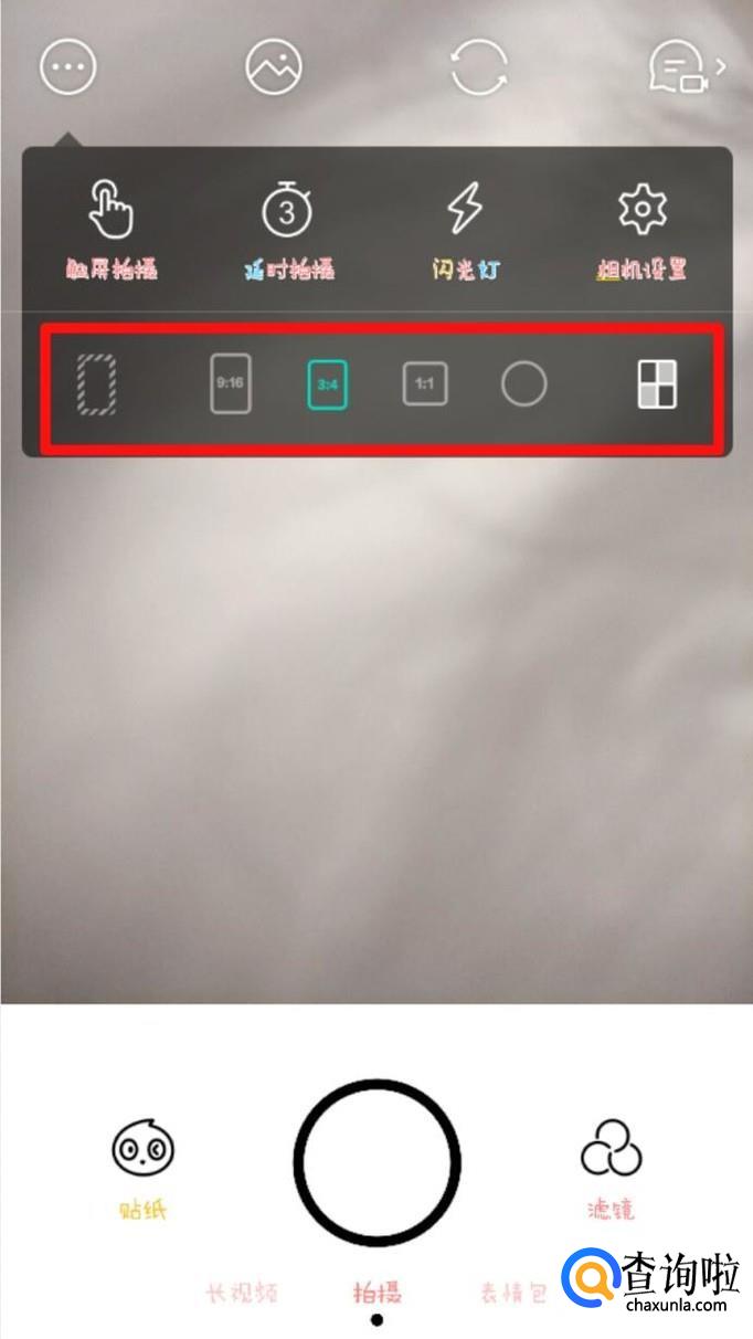 左上角的按钮是个多功能按钮,包括了很多功能,点开之后,这边框起来的部分是关于拍照比例的,也就是拍照时,拍照范围的大小,有全屏的、半屏的、还有多屏的哦!