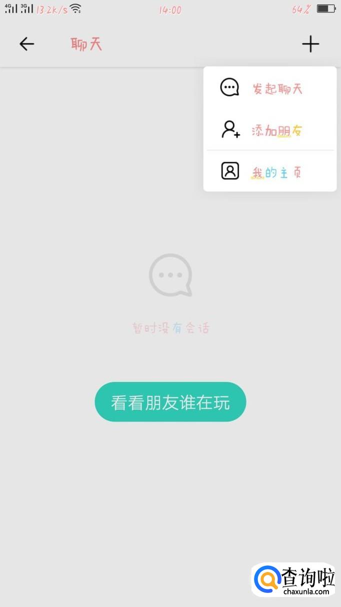 点击社交界面右上角的“+”符号,会出现三个选项:发起聊天、添加朋友和我的主页。