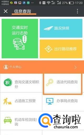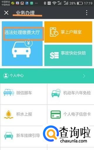 然后点击页面下方的“自助查询”进去“信息查询”界面,接下来店里“违法代码查询”就可以查询自己是否违章及违章记录了。另外点击公众号页面左下角的“业务办理”进去点击左上角的“违法处理缴费大厅”可以在微信上进行缴费。
