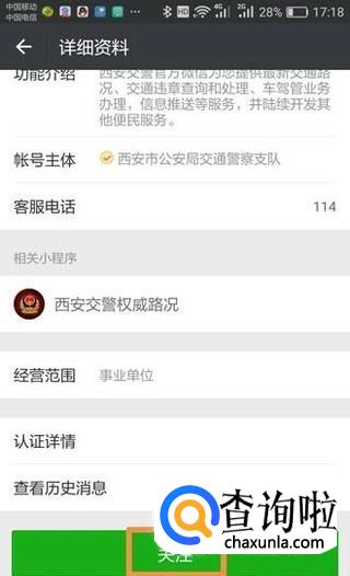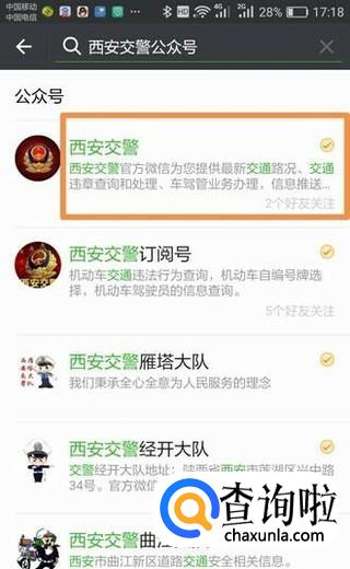 车主自己查询交通违章可以关注所在城市交警公众号,以西安为例,西安的车主可以自己打开微信,在公众号搜索栏中搜索“西安交警”,点击页面第一个进去关注此公众号。
