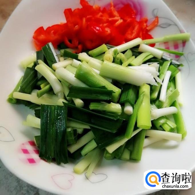 把辣椒,蒜苗,姜丝加进去翻炒一分钟左右。