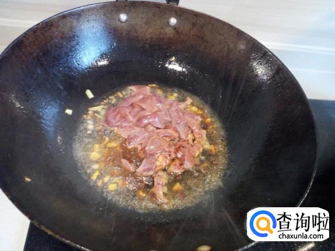炒至鸡心,鸡胗,完全变成微白色,没有粉肉色后,放入青尖椒,略翻炒一下。放入勾兑好的芡汁,芡汁粘稠后,放入味精,关火出勺。