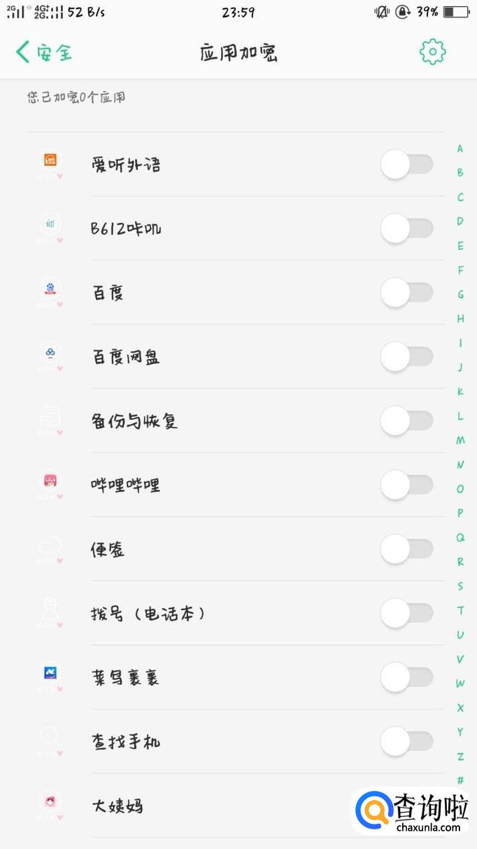 在输入密码过后,可以进入应用加密,在此可对所有手机的应用进行加密设置。