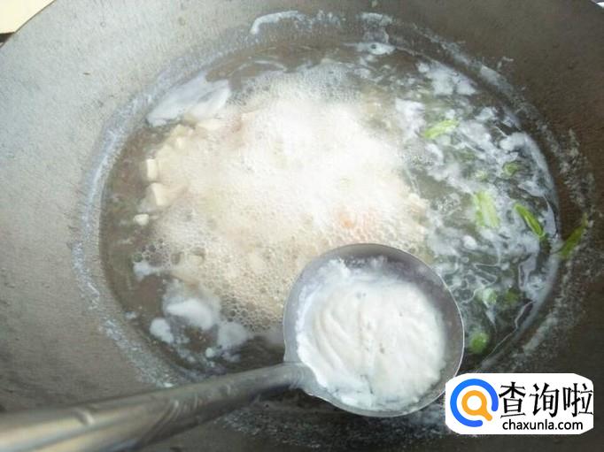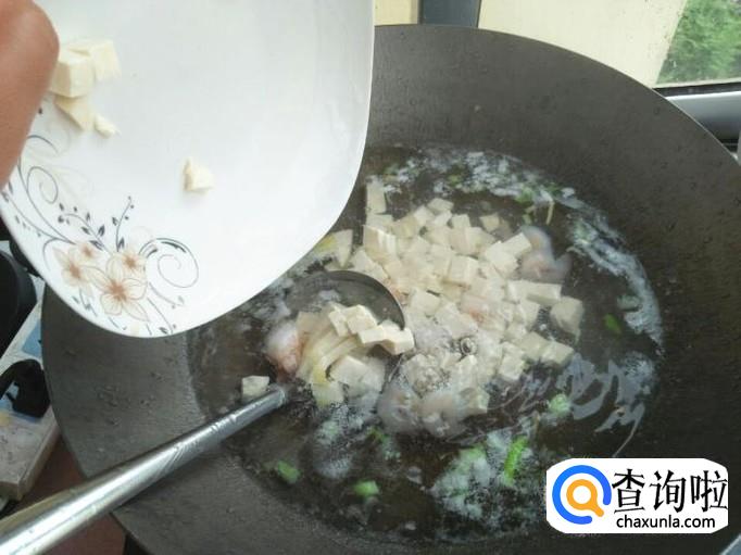 虾仁变色之后,趁着锅里的水还沸腾,立刻把豆腐块倒进去,并且用勺子轻轻的推开移动,让其均匀的受热。