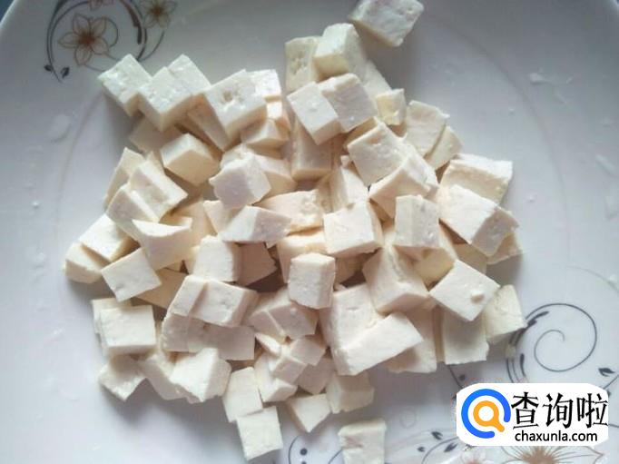 我买的是卤水豆腐,北方人喜欢吃卤水豆腐,不用太多,有一小块就可以了。豆腐不用热水煮,就直接把豆腐切成小块就行。
