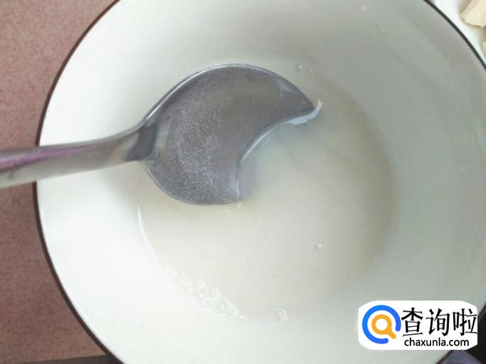 这时候再找来一点淀粉,没有淀粉用面粉也行,因为我发现淀粉没了,所以直接使用的是面粉。不用太多,吃饭的勺子小半勺就可以,加上两小勺水搅拌均匀待用。