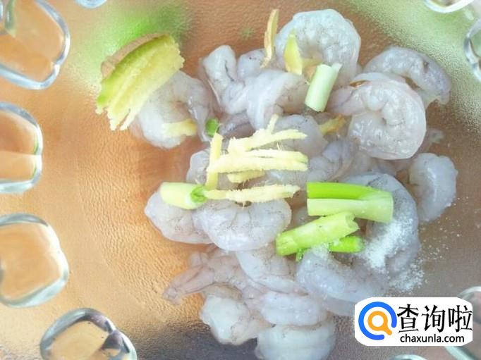 一般虾仁都是速冻好的,所以买来之后浸泡在冷水里让其自己慢慢解冻,解冻之后把虾尾上面的虾线去掉,然后清洗干净,把刚刚切好的葱段和姜丝分别放进去一点,再放进去一点食盐,用手抓一下入味。