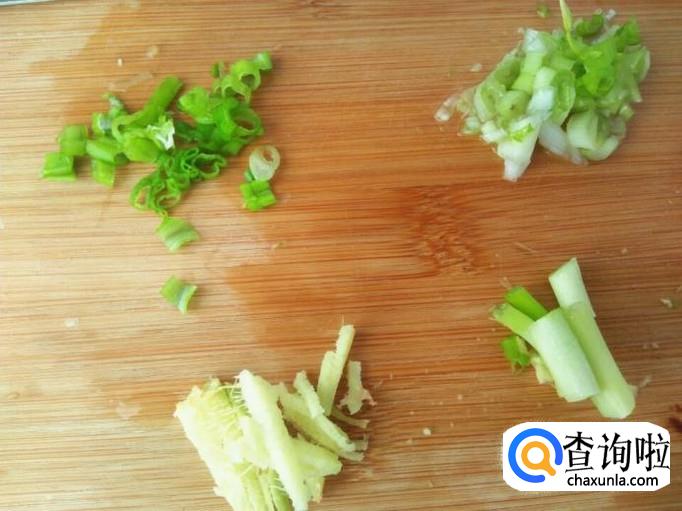 先准备一颗小葱,一半切成葱段,小葱叶子的部分切成葱花状。再把生姜去皮,切成生姜丝待用。