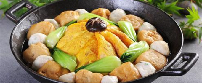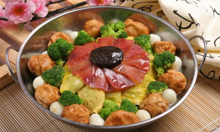 2、用一品锅1只,里面放胶菜心、鱼肚、海参打底。然后将鸭子、火 腿筒、鸡,蹄膀依次围在上面的四周,中间放鸽子,成后一个梅花形;外面再围 上10只鸡蛋,每只鸡蛋上面放一片火腿和一片冬笋;另将青菜心放在鸽子上面, 最后加上鸡汤和味精,上笼将汤蒸开后,放在木炭炉上一起上席,适宜于冬季。