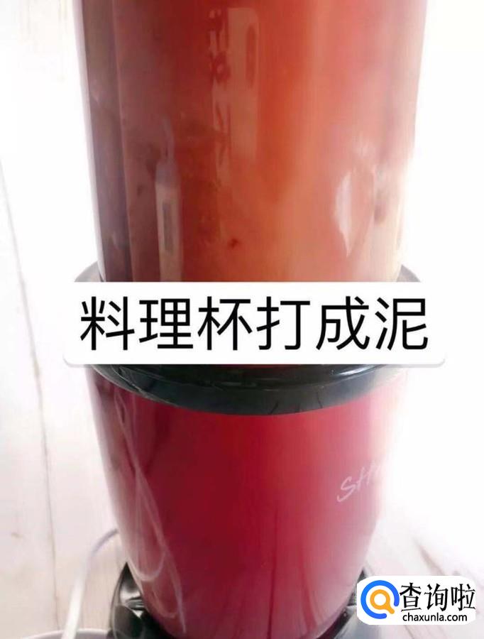 然后把完全煮烂的山楂倒入料理杯中打成泥,如下图所示。小贴士:如果大家家中没有料理杯也可以用绞肉机也是可以的。