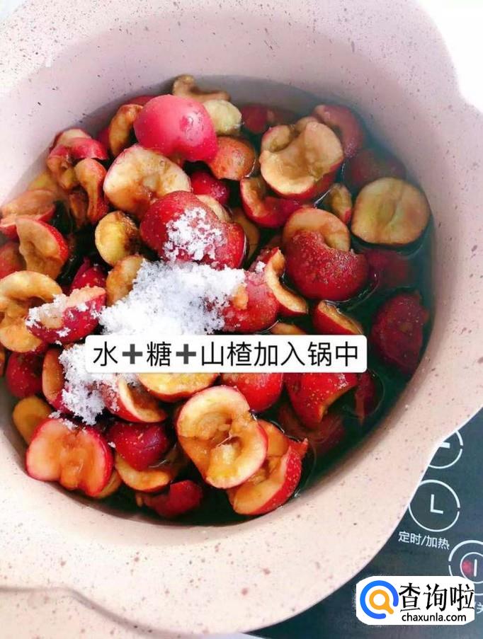 首先将买回来的山楂去核去蒂倒入锅中并加入适量的水和白砂糖,如下图所示。小贴士:1.大家处理山楂的时候,可以先把蒂取掉,然后对半切开,取出里面的核就可以了;2.煮山楂的时候,冰糖的用量大约为每半斤山楂放一勺的糖就差不多了。