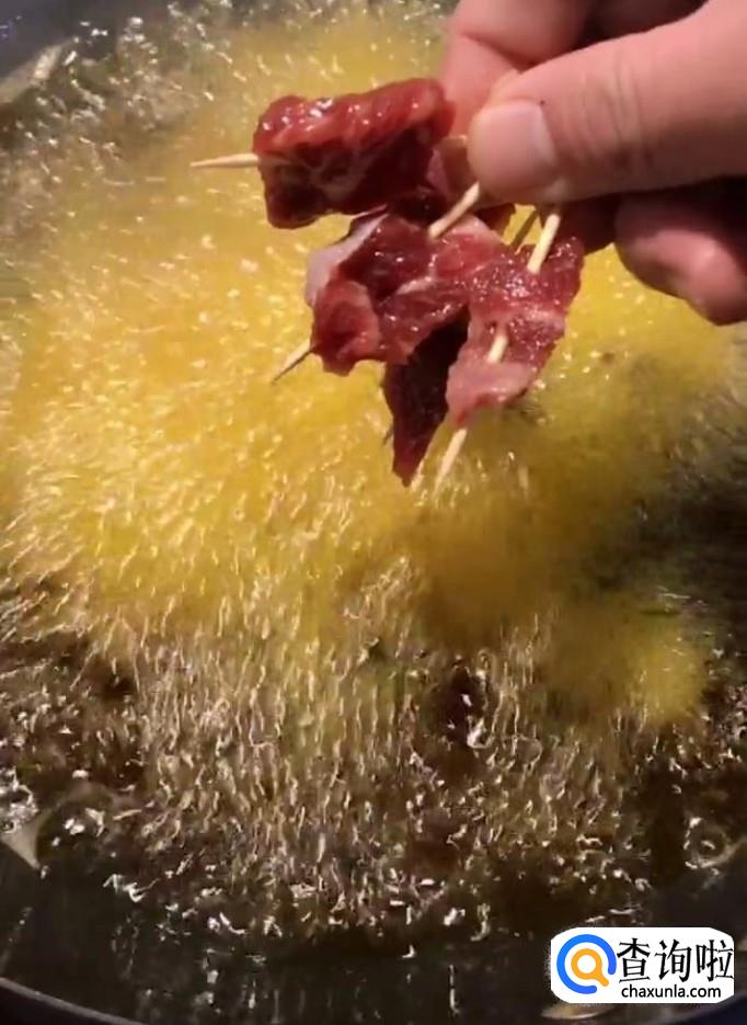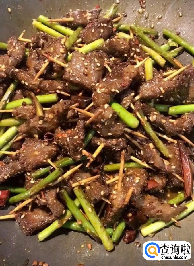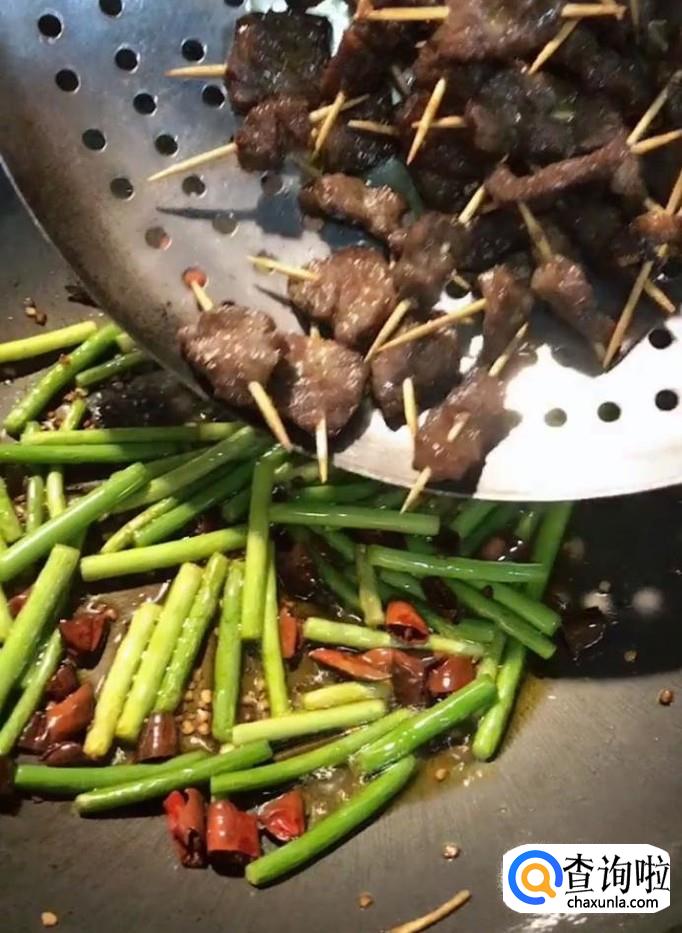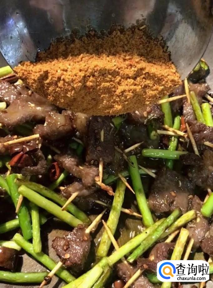 然后放入我们炸好的牛肉,再放点孜然粒,烧烤料,翻炒均匀
