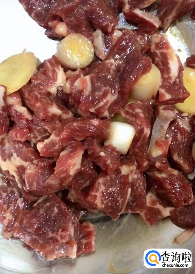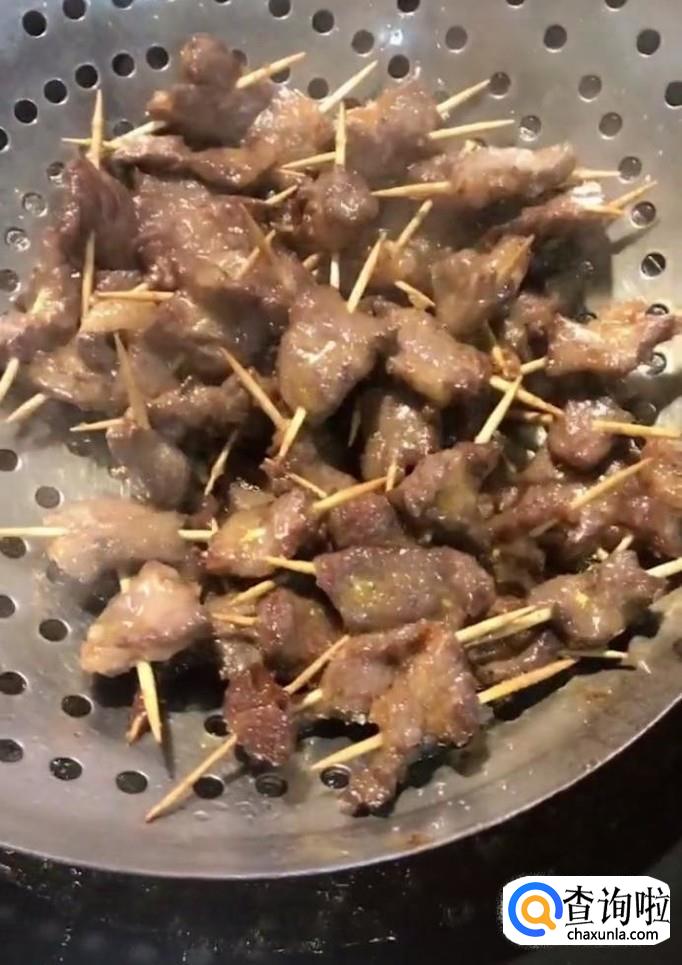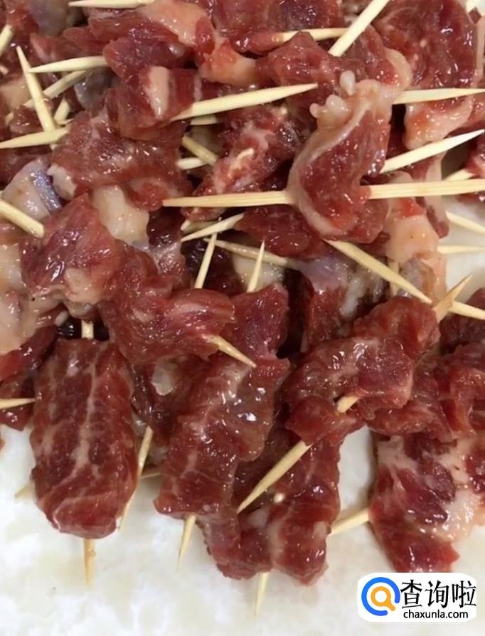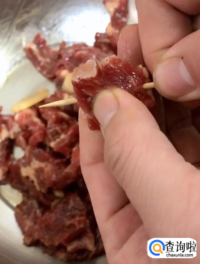 接着我们将腌好的牛肉用牙签串起来,放入盘中备用