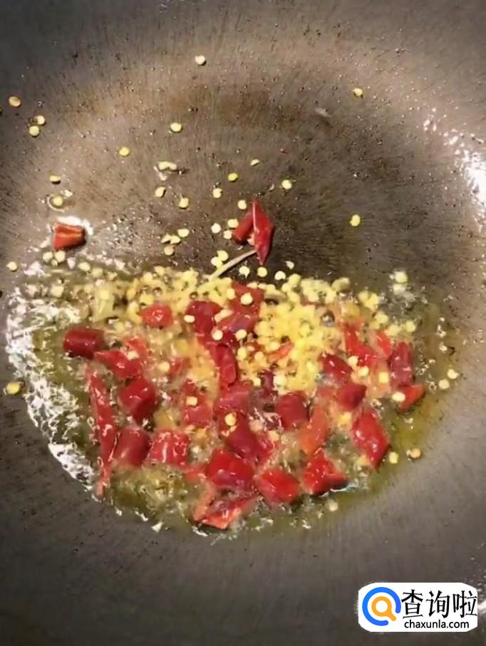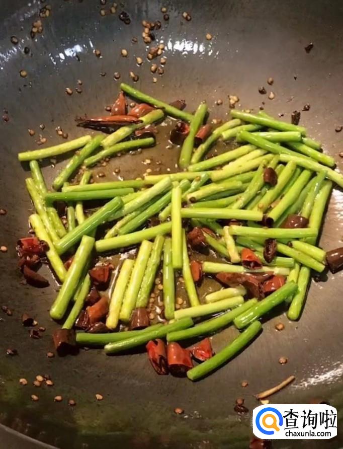 接着我们在锅中留少许底油,放入川椒丁爆香,放入适量的蒜苔,炒香