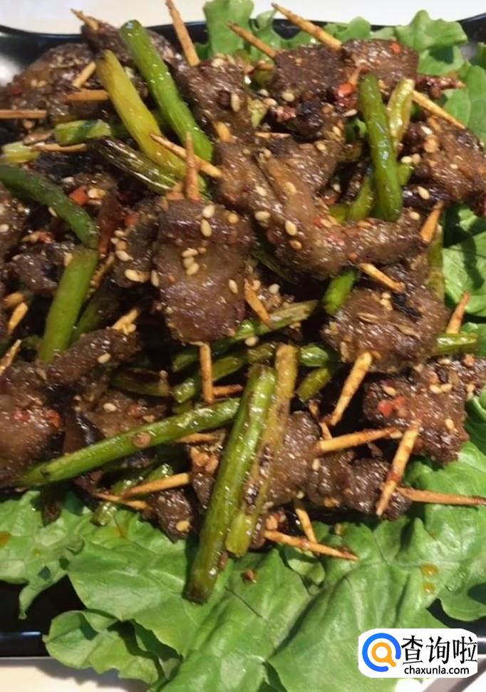 牛肉,葱姜,盐,鸡精,胡椒粉,料酒,蚝油,淀粉,牙签,川椒,蒜苔,孜然粒,烧烤料
