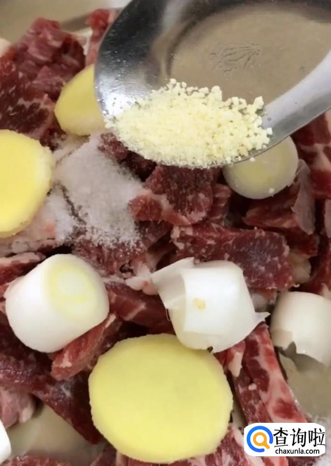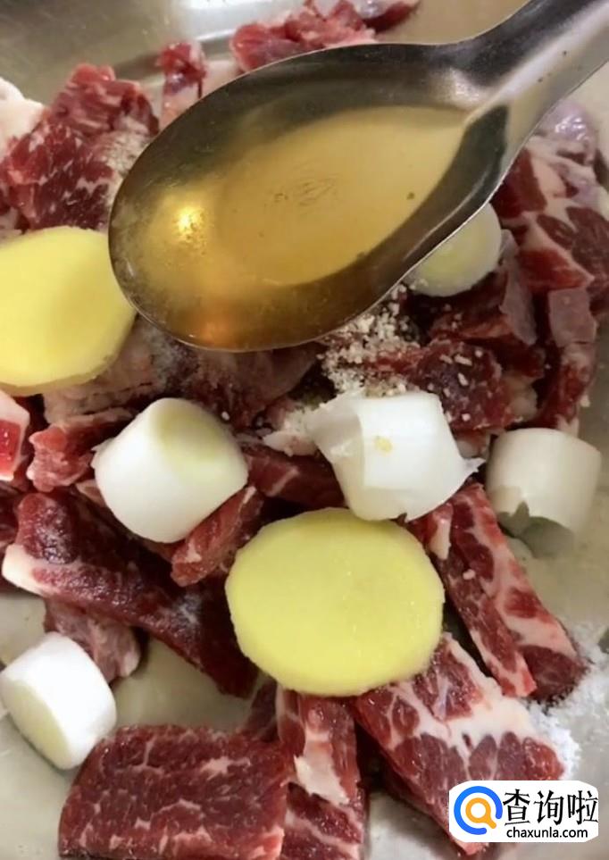 然后我们放入适量的葱姜,盐,鸡精,胡椒粉,料酒,蚝油,再加入适量的淀粉抓拌均匀,腌制十分钟