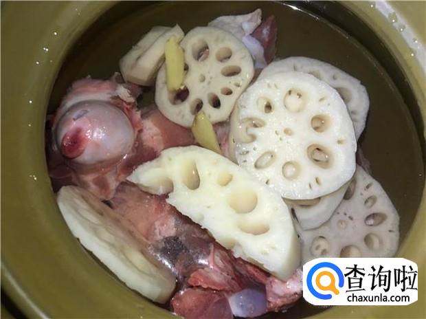 把骨头、姜片、莲藕片一起放入锅中,加入适量的清水,大火煮。大火炖开后,转小火炖。