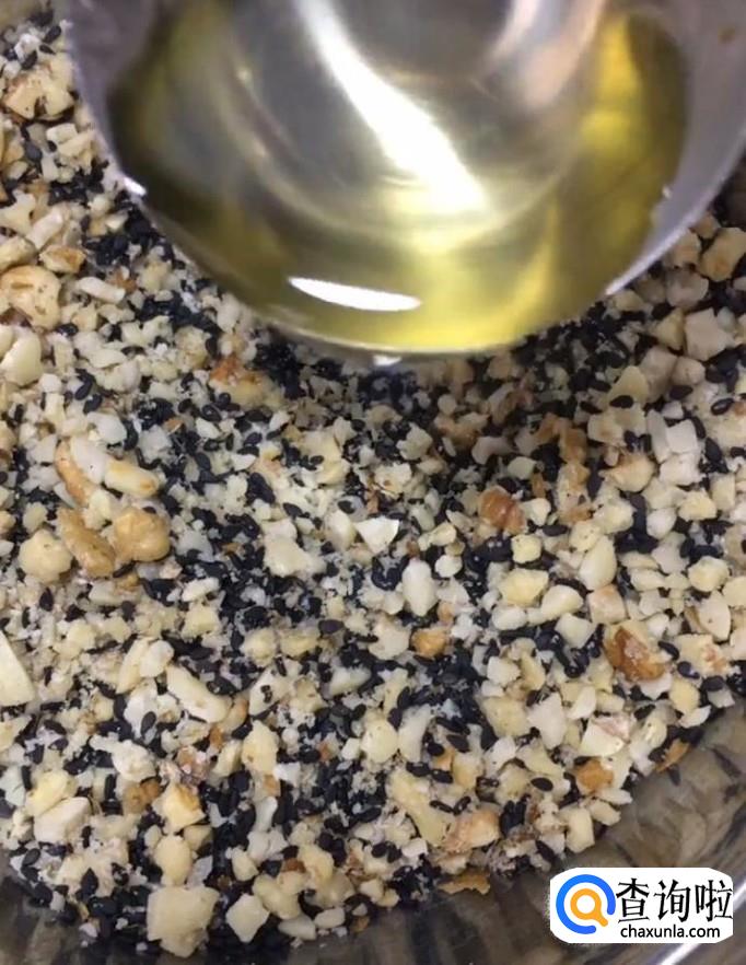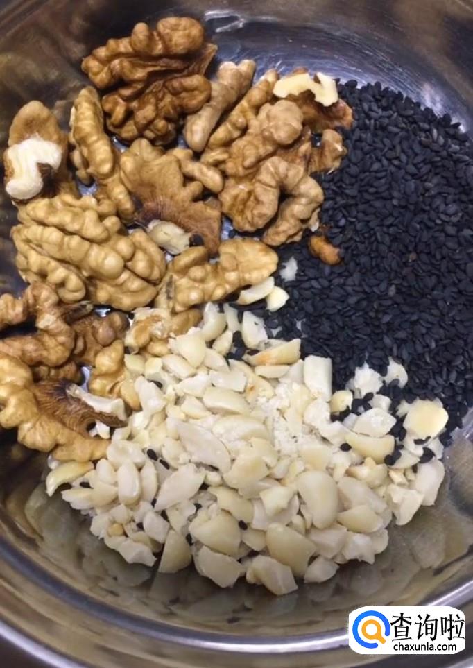 接着我们在一个盆中加入黑芝麻,花生,核桃,用擀面杖砸碎