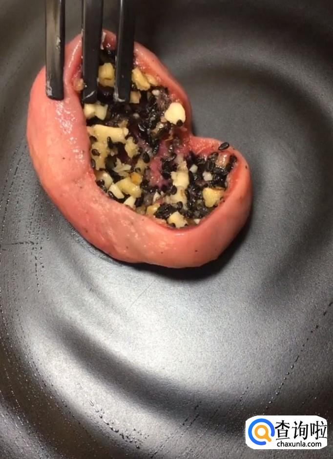 接着我们在面团上揪一块面,揉成球压成小饼,包上调好的馅,团成球