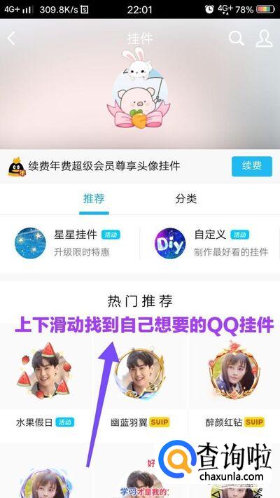 进入QQ头像挂件的界面时,我们可以通过上下滑动来找到自己喜欢的QQ头像挂件。