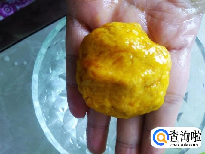 把手沾湿水,然后抓适量的粉团揉压成小饼。