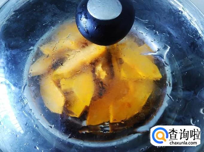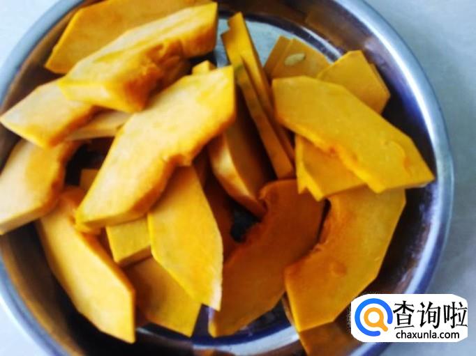 南瓜去皮去籽,然后切成片。
