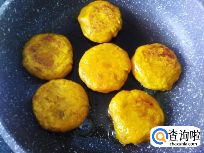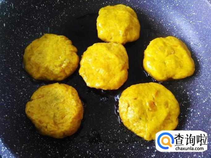 开火下油,把做好的小饼摆到锅里用小火煎。