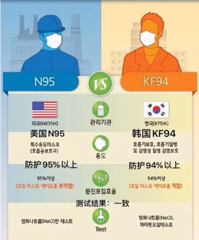 KN95是我们国家的防护口罩标准,指的是直径0.3μm非油性颗粒物过滤大于95%。而KF94口罩则是韩国生产制定的标准,根据韩国食品药品管理局(MFDS)官网的数据,该标准下的口罩对于直径0.4μm的颗粒物过滤率大于94%。