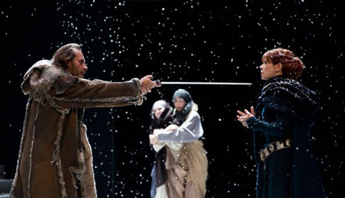 《麦克白》剧写苏格兰大将麦克白受女巫诱惑,在野心和夫人的驱使下,杀君自立,后终日被噩梦纠缠,神思恍惚。其妻也发狂自杀而死。最后王子率兵讨伐,麦克白兵败而死。