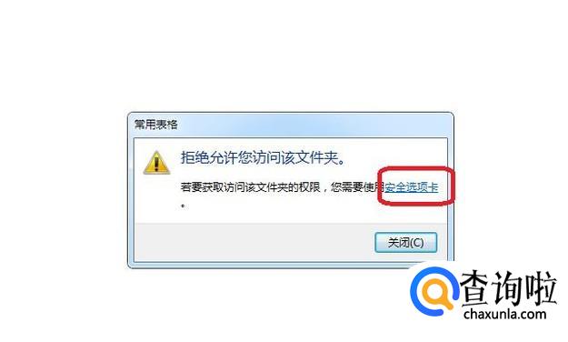 提示若要继续访问,需要使用“安全选项卡”,我们点击一下(右键点击文件夹,弹出菜单后选择“属性”,也能进入“安全选项卡”)。