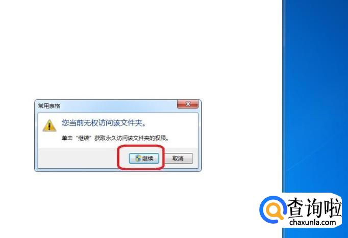 如图所示,我们双击打开文件夹时,被提示“无权访问该文件夹”,我们点击“继续”。