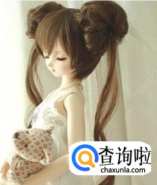 这是一款伪短发造型,倾斜刘海设计的长发将上层的发丝再两侧做成蓬松感的丸子头扎发,垂落下来的长发做成螺旋烫处理,而有着折耳设计的短发有着波波头的设计,很别致的造型。