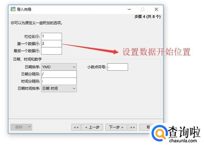 然后需要设置一下数据的开始位置,这里需要在第一个数据行的输入框里面输入2,如下图所示
