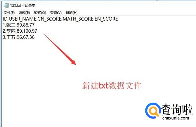 接下来我们新建一个txt文件,在文件中加入一些数据,注意第一行必须是数据表的字段,如下图所示