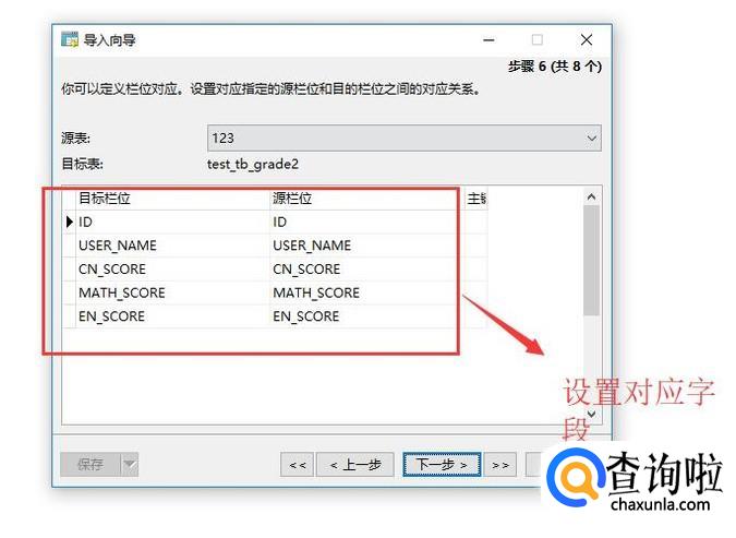 接下来还需要对应一下源表字段和目标表的字段,这里一定要设置好,否则会导入错误,如下图所示