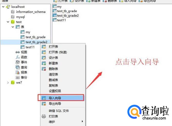 然后我们选中新建的数据表,右键单击选择导入向导选项,如下图所示