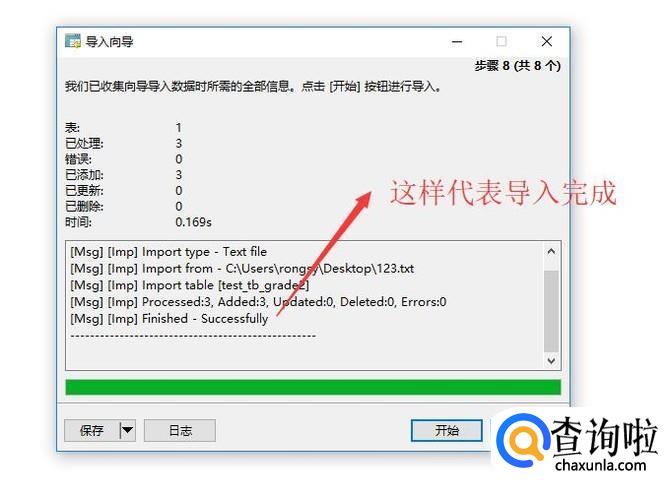最后点击开始按钮以后就开始导入数据了,当看到日志中有Finished字样则代表导入完毕了,如下图所示