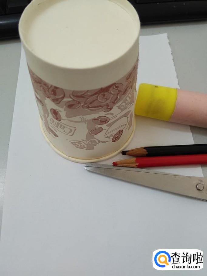 准备纸杯、纸,彩笔,剪刀和胶棒。