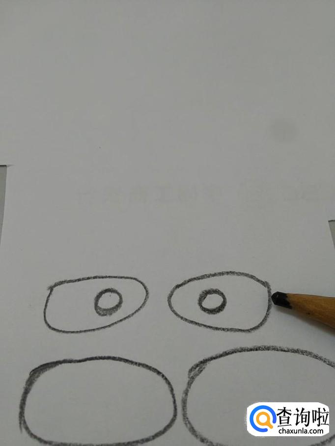 再用黑笔画两个一头大一头小的瓜子形状,表示熊猫的眼睛,在眼睛里面画两个圆形,表示眼珠。