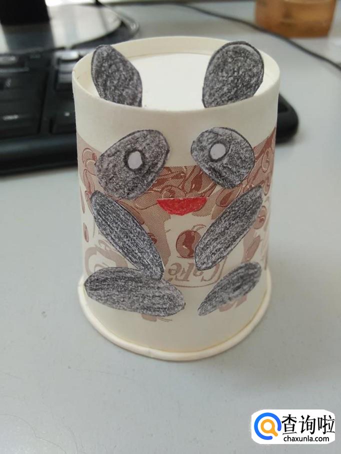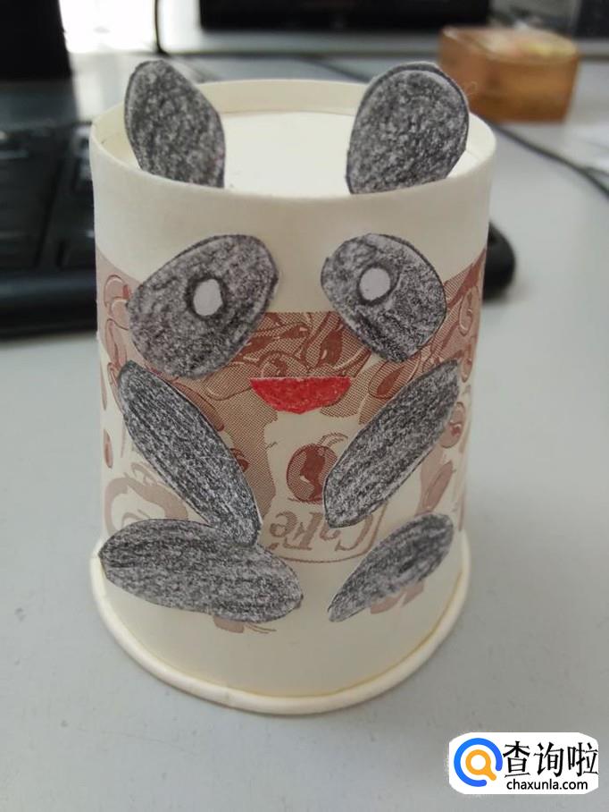 将两只耳朵粘在纸杯的上方,将眼睛和嘴粘在纸杯的中间,将四肢粘在纸杯的下方,一个可爱的纸杯熊猫就做好了。