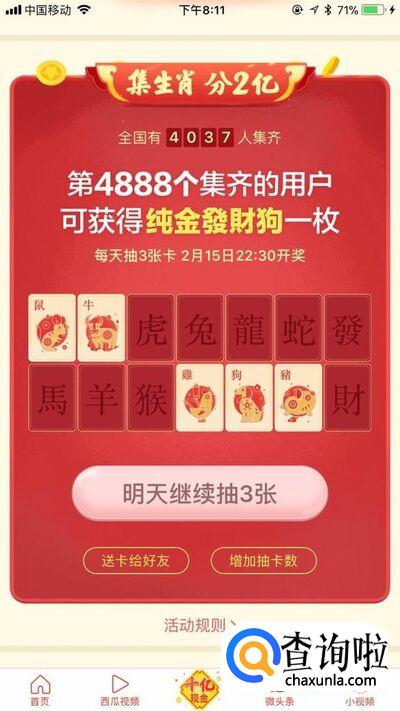 需要注意的是你每天可以免费抽取生肖三次,你也可以通过完成一些任务,获得抽取生肖的机会,如下图所示。