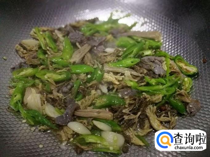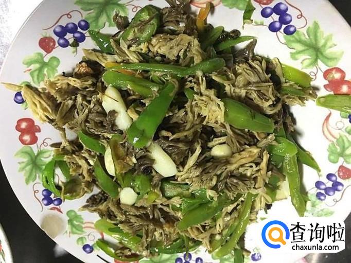 下蒜片、青椒、刷把菌一起炒熟,加适量盐起锅。在山上拣到几朵豆壳菌,一起炒到里面。