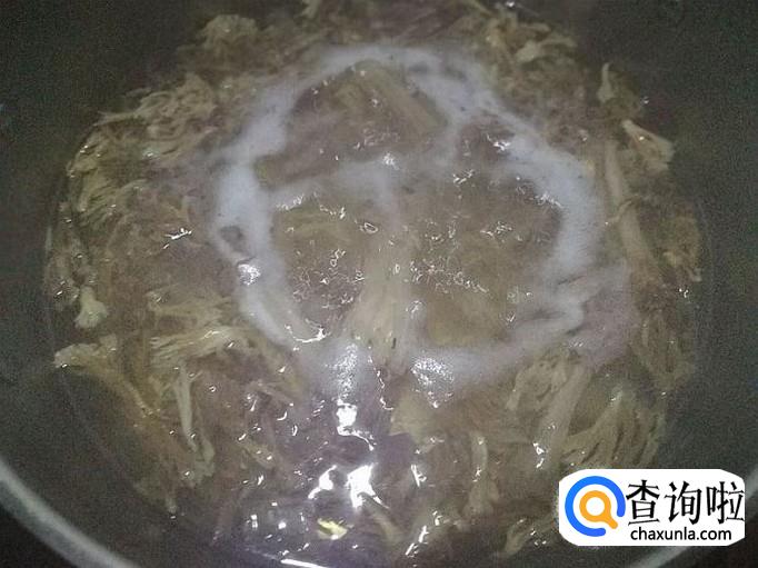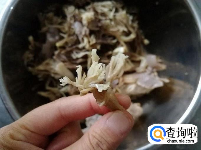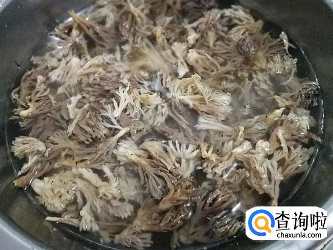 将焯水后的刷把菌放到清水里漂几个小时。刷把菌稍带苦味,清水漂一下可去除苦味。