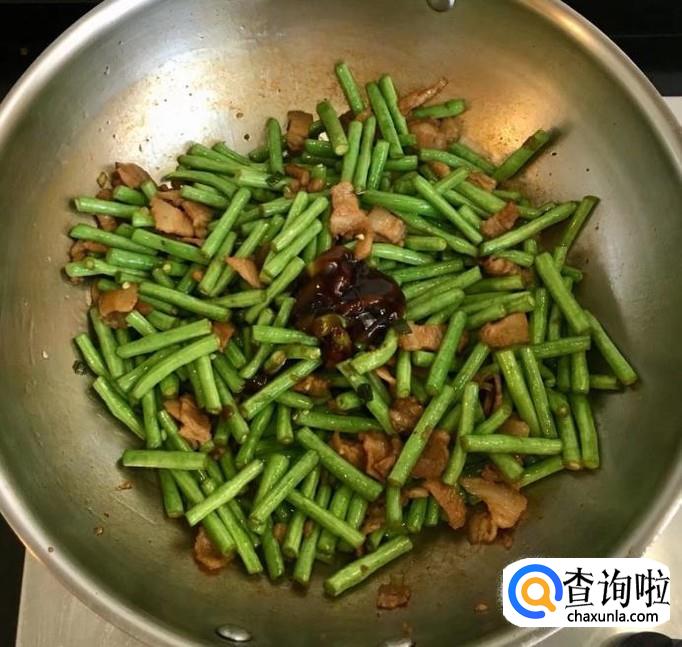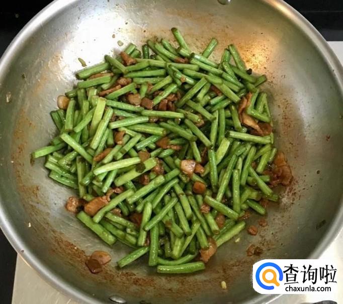 炒至长豆角吸收油脂后加入适量的盐和蚝油调味,继续翻炒至长豆角断生并熟透后即可出锅
