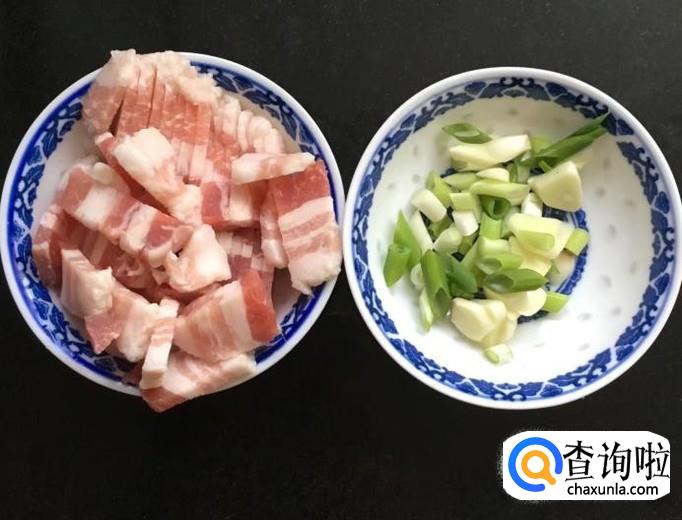 五花肉100克冲洗干净切成厚薄均匀的五花肉片,葱、蒜剥去外皮清洗干净分别切成葱花、蒜片